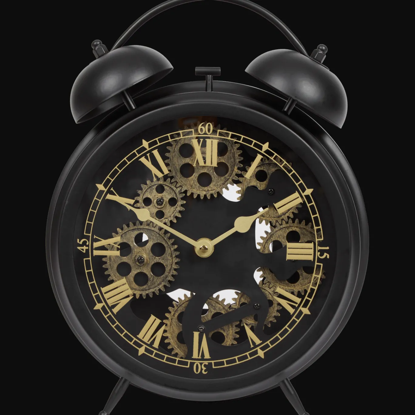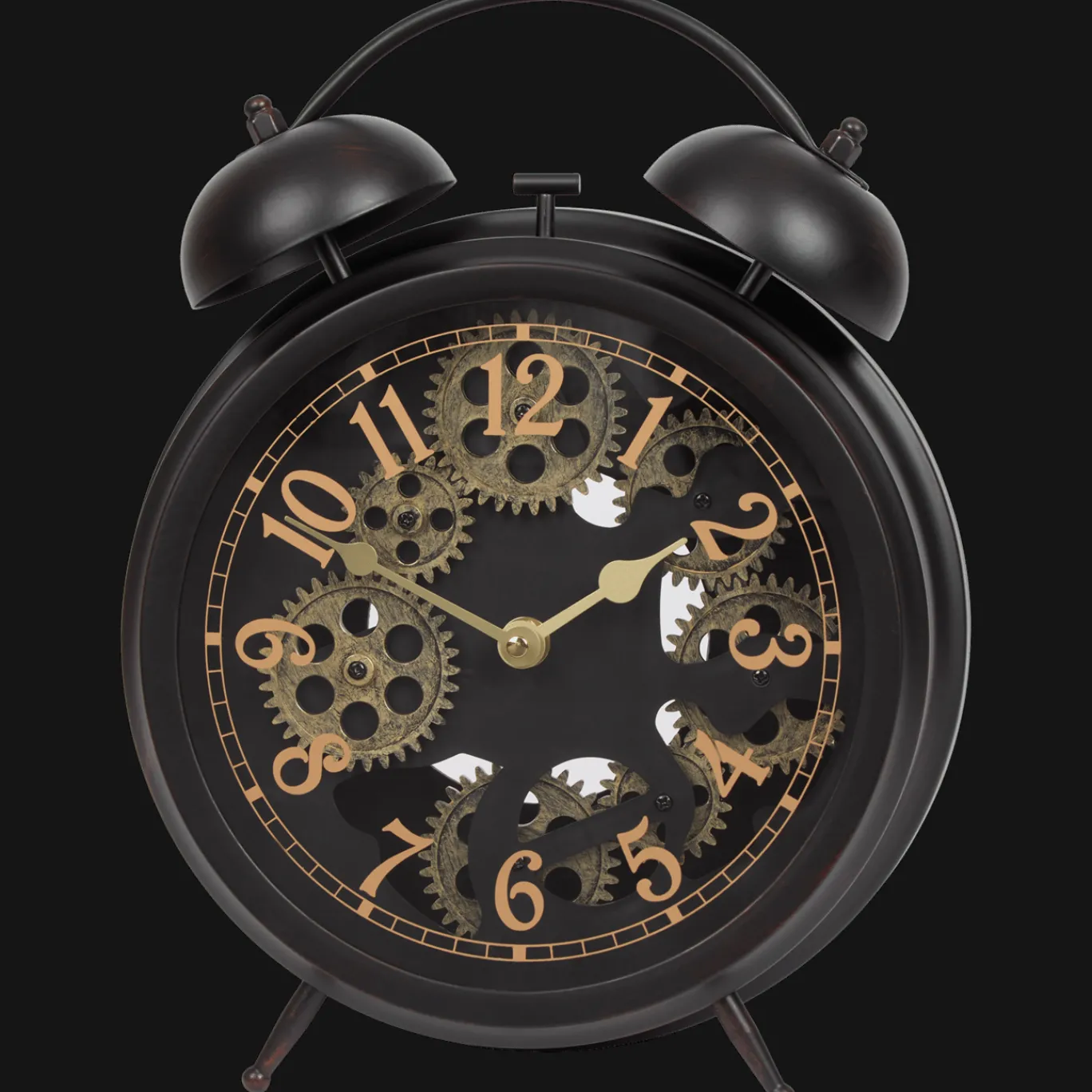 Stijlvolle klok met bellen en zichtbare tandwielen.